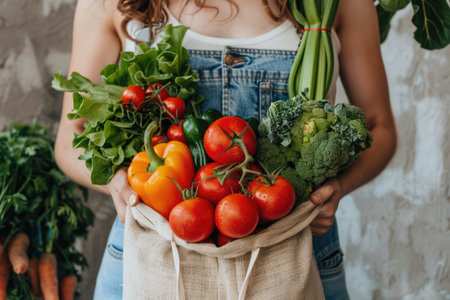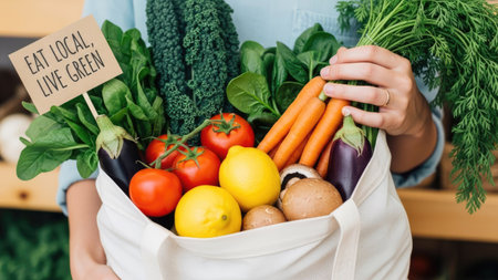 A person holds a reusable tote bag overflowing with various fresh vegetables and fruits. The vibrant assortment includes carrots, tomatoes, lemons, and greens. The composition showcases a close-up view with natural lighting, suggesting an emphasis on healthy eating habits. Suitable for editorial and commercial purposes related to wellness and sustainability.