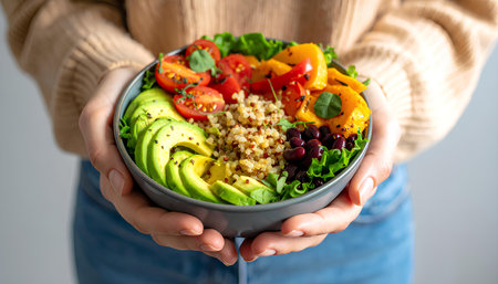 Woman holding bowl of quinoa salad with avocado, cherry tomatoes, black olives and arugula