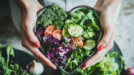 A close-up image of hands gently holding a heart-shaped bowl filled with fresh vegetables, celebrating healthy eating and nutrition in a vibrant and colorful presentation.