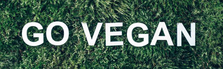 Word go vegan on moss, green grass background. Top view. Copy space. Banner. Biophilia concept. Nature backdrop