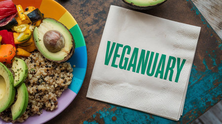 a vegan plate with avocado, quinoa, and vegetables next to a napkin that says veganuary in green letters