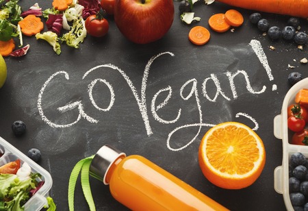 Eating right, vegetarian, motivation and dieting conceptual background. Assortment of organic meals on black chalk board with go vegan inscription and copy space