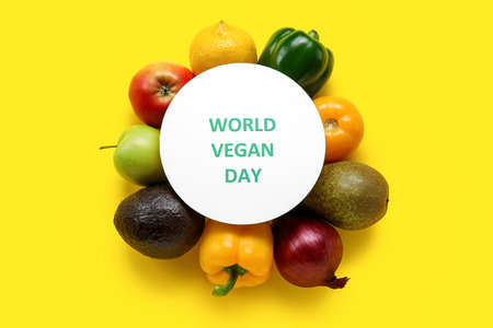 Vegetables, fruits and card with text WORLD VEGAN DAY on color background