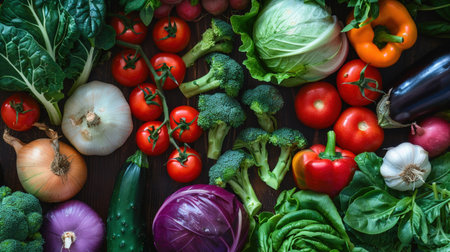 Fresh colorful organic vegetables from above. Top view, flat lay. Different vegetables for eating healthy on dark background. Clean eating food frame.Vegetarian, vegan.
