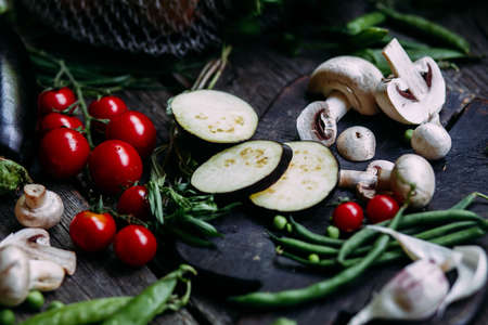 Farm tomatoes, eggplants and greens lie on a wooden surface. Concept of biological, bio products, bio ecology, grown by yourself, vegetarians
