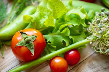 Farm market photo with different vegetables and greens. Organic products and healthy lifestyle photography. Fresh food on the wooden background.