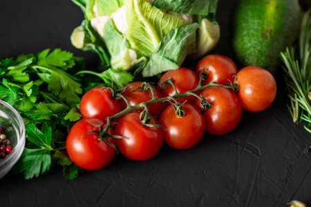 Branch of cherry tomatoes. dark background. Various vegetables. Vegetarian food. Raw food diet.