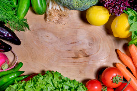 Fresh colorful organic vegetables on a rustic wooden table background.