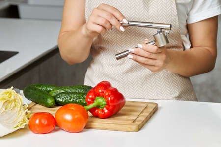 Womens hands hold a garlic press in their hands. Process of cooking something delicious