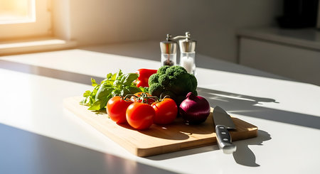 Fresh vegetables on cutting board on white kitchen table. Healthy food concept