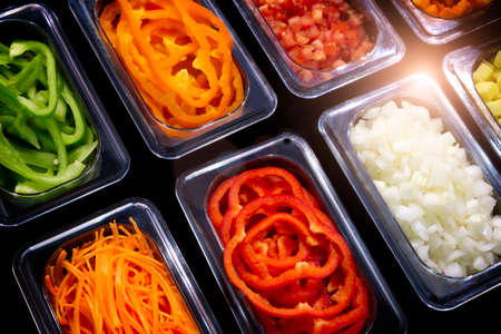 Fresh slices of vegetables in transparent plastic containers on a black background, vegetable ingredients for cooking