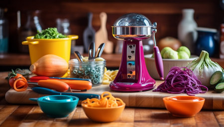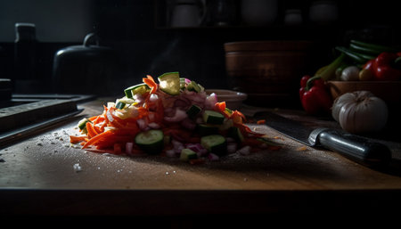Preparing homemade salad with fresh vegetables and rustic kitchen utensils generated by artificial intelligence