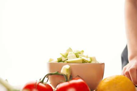 Cutted food for salad, cucumbers tomatoes and green onion, vegan healthy food, preparing food