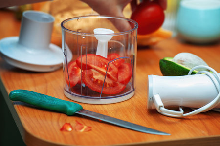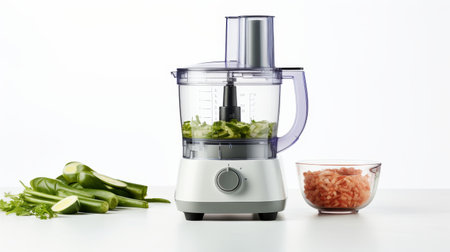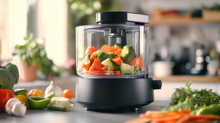 Brightly colored vegetables chopped and placed inside a food processor, surrounded by other fresh ingredients, symbolizing healthy food preparation.