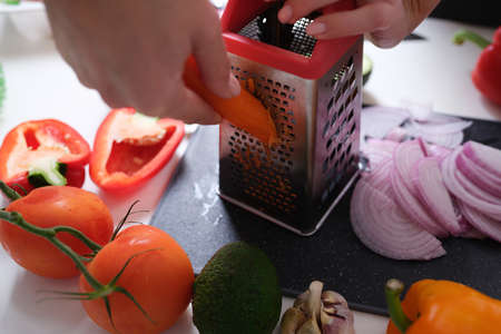 Woman grates vegetables in kitchen. Preparing vegetables for lunch meals