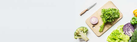 top view of ripe vegetables near wooden cutting board with parsley and onion on white surface, panoramic shot