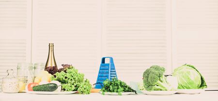 This is what we need to cook healthy meal. Grater and bottle near vegetables. Vegetables easy meal. Healthy dish. Greenery lettuce cabbage broccoli fresh vegetables and cooking utensils close up.
