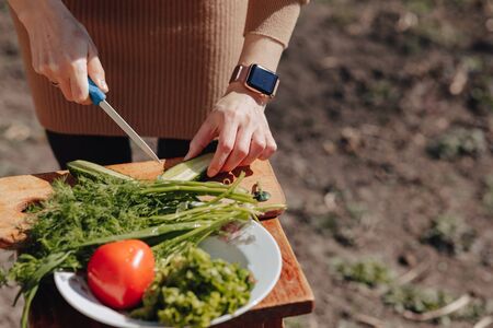 girl slices vegetables on the board and prepares a salad on the nature outside. sunny day and cooking. close-up view.
