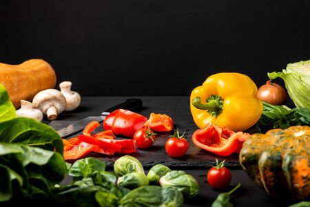 Close up assorted cut and sliced fresh vegetables on black cooking board, high angle view