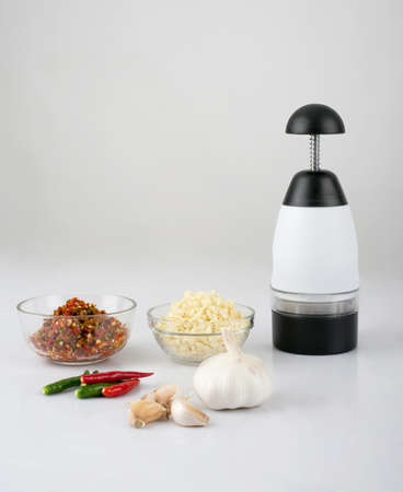 Chopper garlic tool with chopped garlic and chili isolated on white background