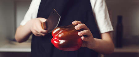 Son preparing healthy food for family dinner. Culinary master class for children. Boy want to be a professional chef. Boy cutting red pepper for cooking dinner. Chef wearing apron at the kitchen.