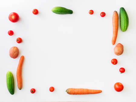 Fresh farm vegetarian and vegan vegetables on white background. Healthy food supermarket banner. Zero waste concept. Frame layout flat lay. Top view