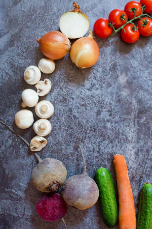 Vegetable background. Composition of fresh vegetables with place for text on gray concrete background