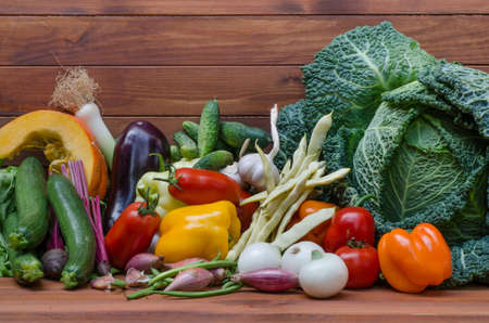 Fresh organic vegetables on a rustic wooden background. Top view.