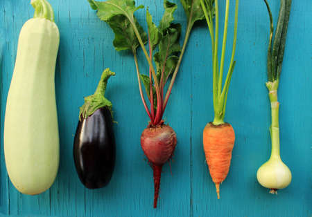 vegetables on a blue wooden background. zucchini, eggplant, carrot, onion