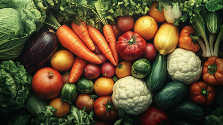 Fresh vegetables including cabbage, onions, and tomatoes are piled together, showcasing vibrant mix of colors and textures. This captures essence of healthy eating and sustainability.