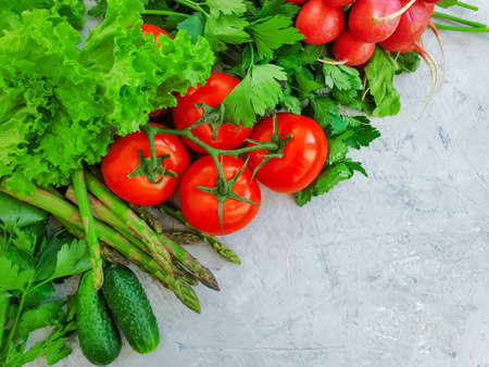 Vegetable background. Composition of fresh vegetables with place for text on gray concrete background
