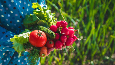 The child holds in his hands a lot of vegetables harvest from the garden. Selective focus. Food.