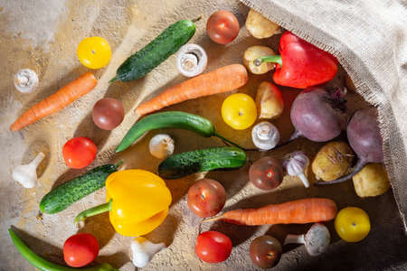 vegetables spilled out of the bag onto the table. View from above. fresh vegetable flatlay