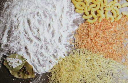 Types of pasta and pink rice with flour, bay leaf with coarse salt and pepper on a brown background close up. High quality photo