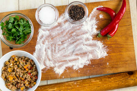 Empanadas cooking preparations: flour with spices, culinary herbs and minced pork on wood board