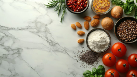 A vibrant assortment of fresh ingredients, including tomatoes, flour, and herbs, arranged artfully on a light surface, ideal for cooking or recipe inspiration.