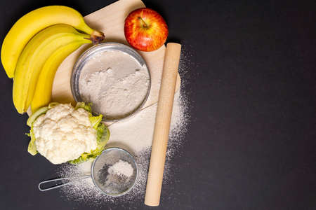 banana flour, Apple, cauliflower Gluten free low carb plant floor. copy space for text. gluten intolerance concept.
