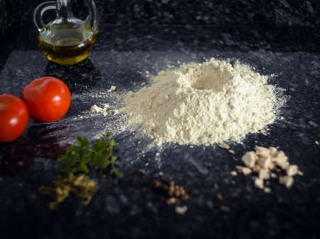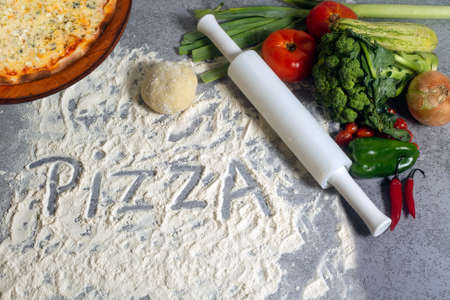 The raw pizza ingredients on the gray background written pizza with wheat flour