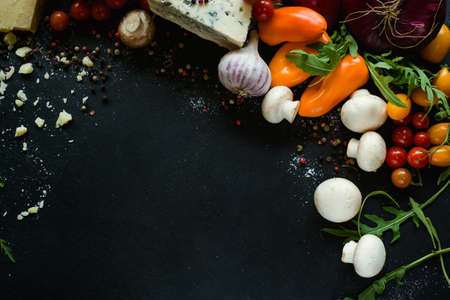 Ingredients for pizza on a black background mushrooms pepper cheese basalic sauce flour and tomatoes. Top view of the isolate. top view