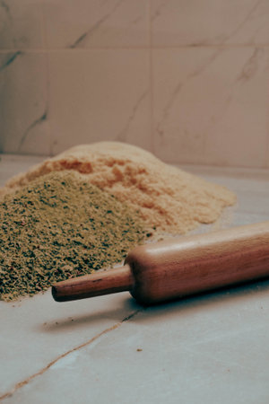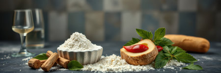 Exploring traditional cooking ingredients with flour, spices, and herbal garnishes on a rustic table