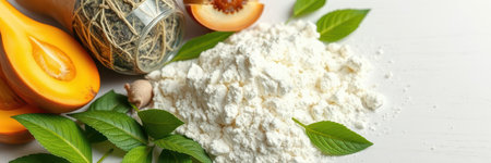 Natural ingredients and powder with green leaves and fruits displayed on a white surface