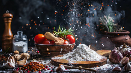 A dynamic photo of culinary spices and ingredients, including flour, tomatoes, garlic, and herbs, being toasted and sprinkled on a dark background.
