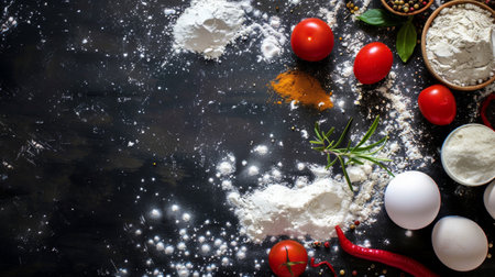 Ingredients including flour, eggs, and tomatoes scattered on a dark kitchen counter. Culinary and rustic composition highlighting the essentials for baking and cooking.