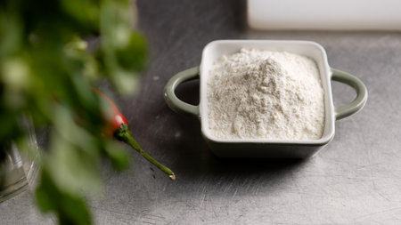 Flour in a small ceramic bowl with handles, parsley and chili pepper on stainless steel kitchen counter