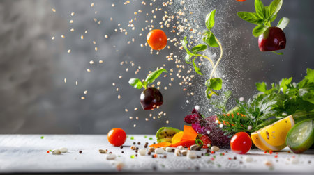 Dynamic scene of fresh vegetables and herbs in motion, showcasing bright colors and textures, ideal for culinary and food-related themes.
