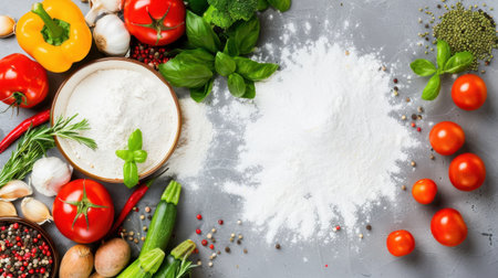 A vibrant assortment of fresh vegetables and herbs surrounds a mound of flour on a grey background, perfect for culinary creation and recipe inspiration.
