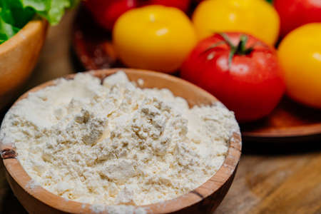 a wooden bowl of flour and vegetables on the kitchen table. farm products