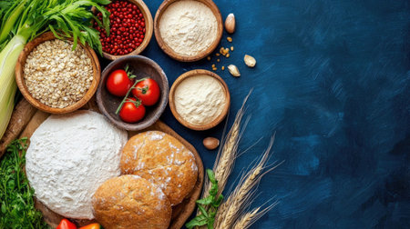 An assortment of fresh cooking ingredients including flour, tomatoes, oats, and herbs arranged in rustic wooden bowls on a blue background, perfect for culinary inspiration.