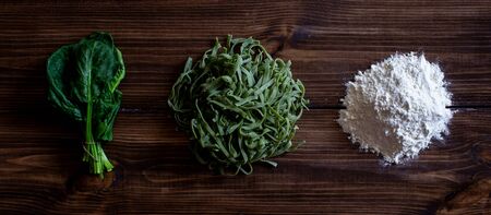 Spinach Tortellini Ingredients for making homemade spinach tortellini on wooden boards. Copy space