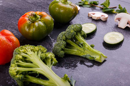 Close-up of broccoli and bell pepper, slices of cucumber, and champignons on a black background, close-up, beautiful concept of healthy eating